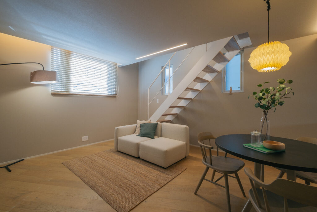 空間全体を優しく明るくすっきり見せる真っ白な鉄骨階段はまるでインテリアのような存在感。