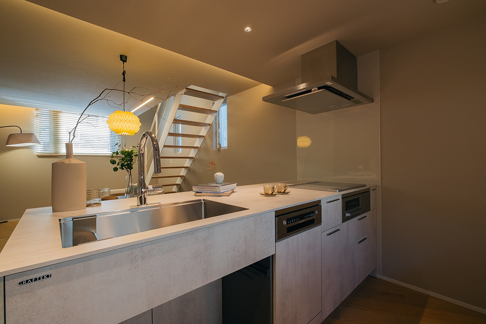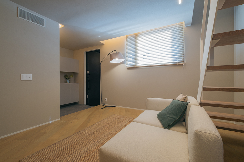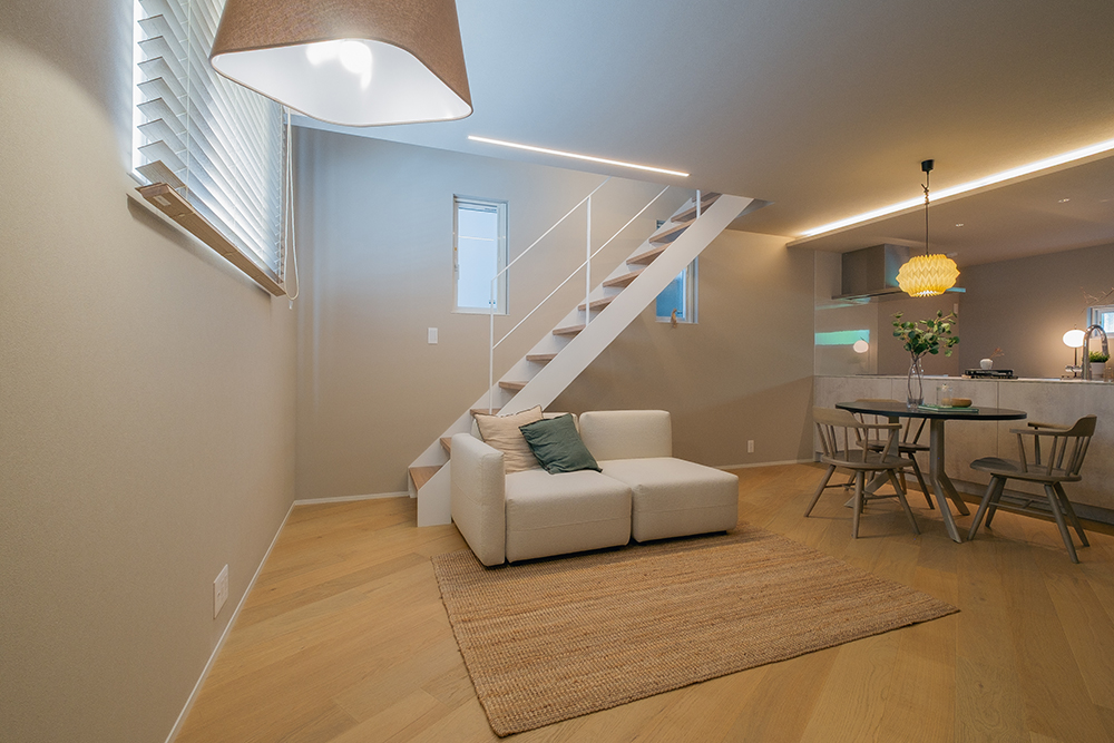 空間全体を優しく明るくすっきり見せる真っ白な鉄骨階段はまるでインテリアのような存在感。
