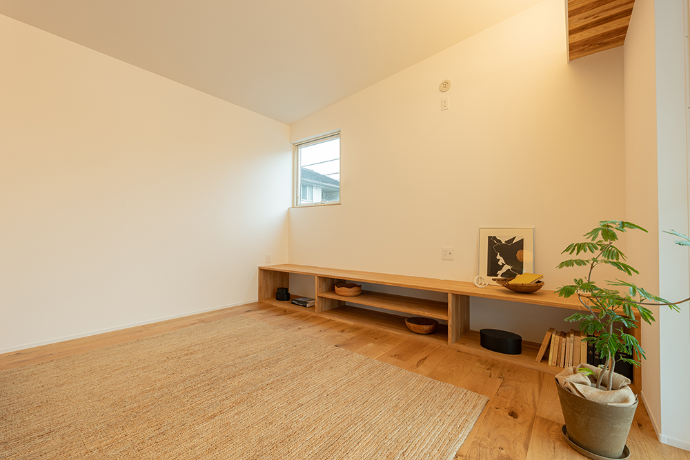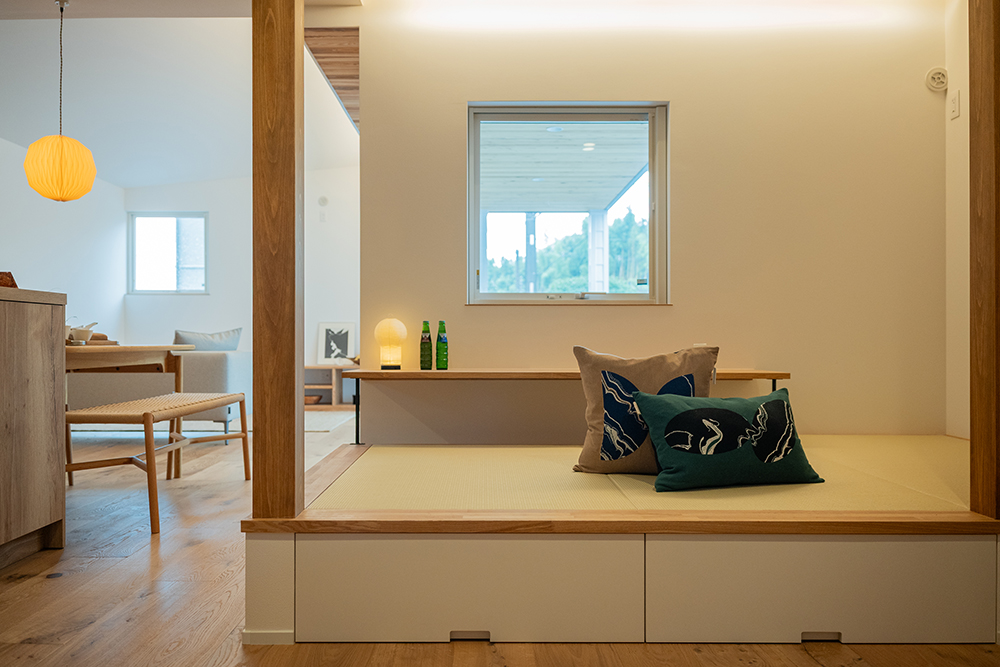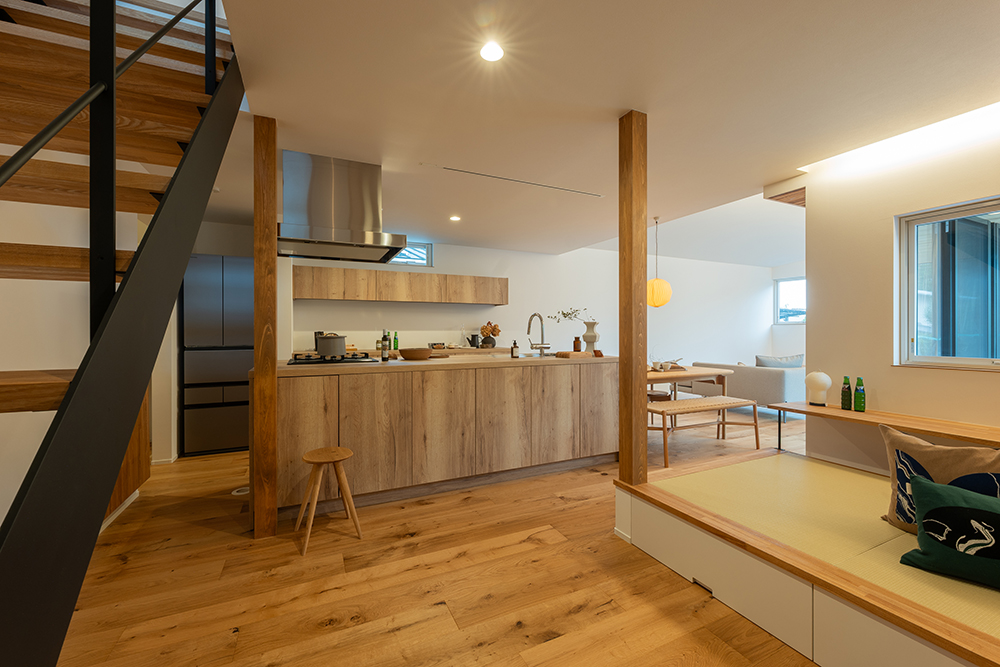 夫婦二人で立てるようにと広めに作ったキッチン。大きな明るい窓。家族でお昼寝もできる小上がりの畳スペース。